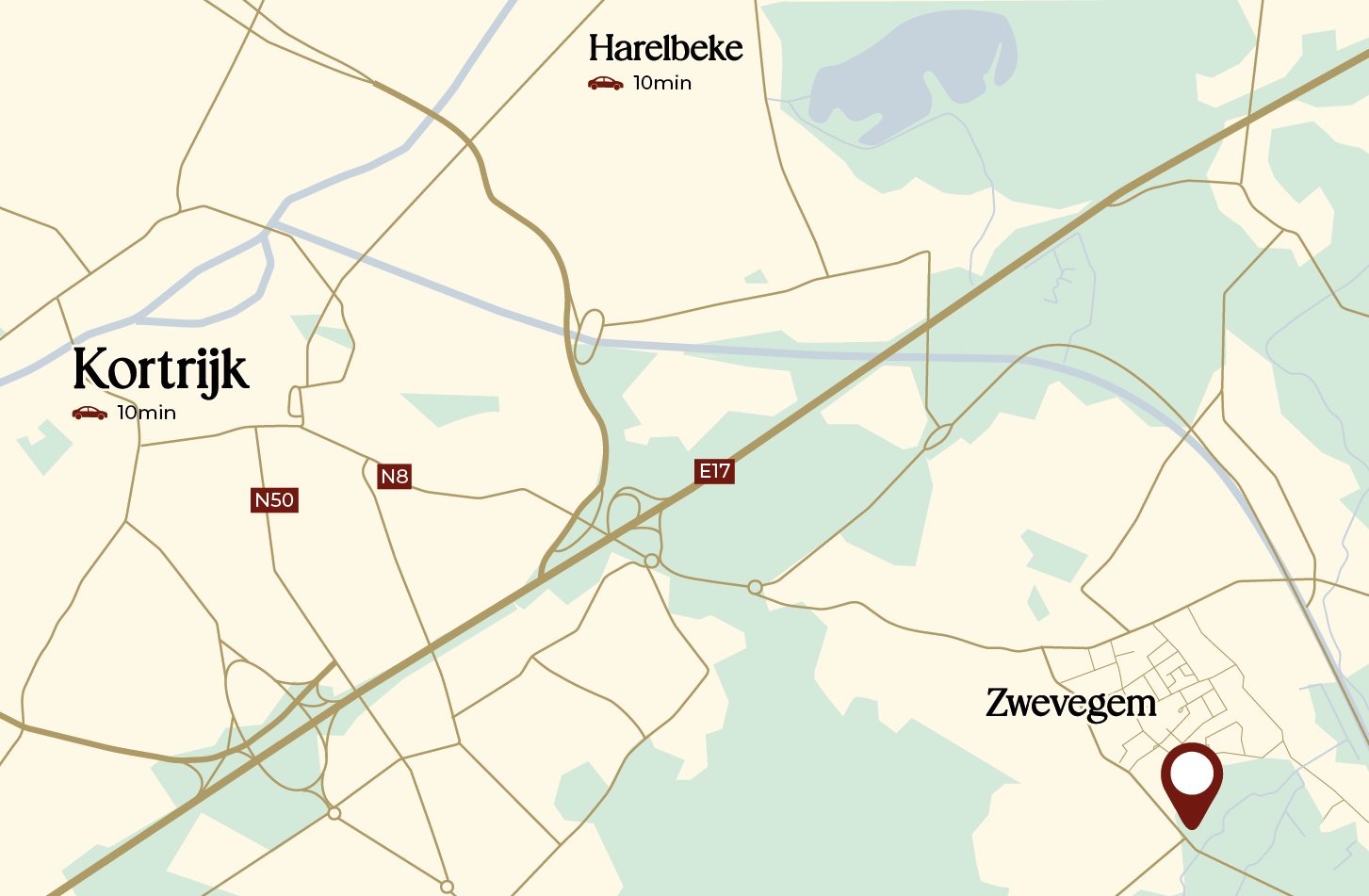 Wanneer je buiten Zwevegem moet zijn, zit je meteen op de juiste as: je raakt vlot naar Kortrijk en vanuit de snelweg nog verder. Ideaal voor woon-werk, afspraken of de rest van Vlaanderen te bereiken.